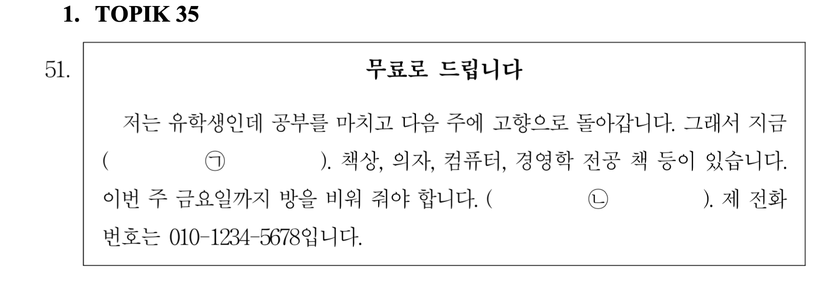 Và các bạn biết không, đến khoảng 1 nửa đề thi TOPIK chính thức ở câu 51 đều ra vị trí câu hỏi đấy? Xem đề dưới đây nhé: