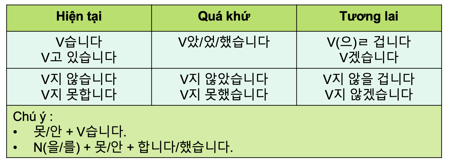 Ví dụ như 어제, 지난 주, 다음 달, 오늘 … thì các bạn phải chia đúng thì hiện tại, quá khứ hay tương lai nhé.