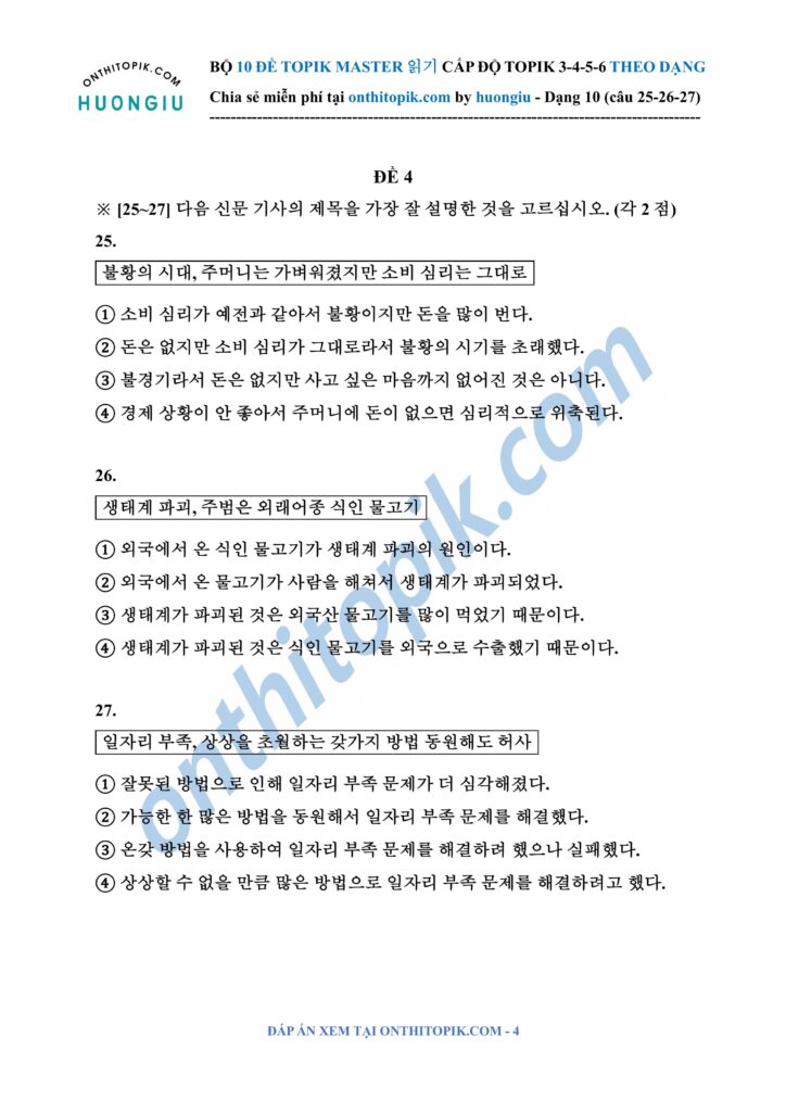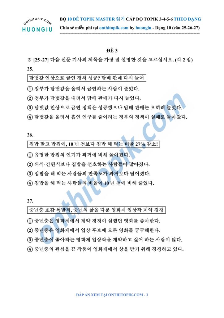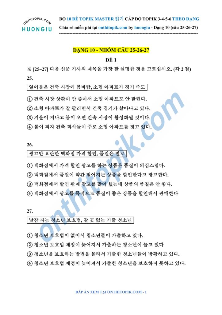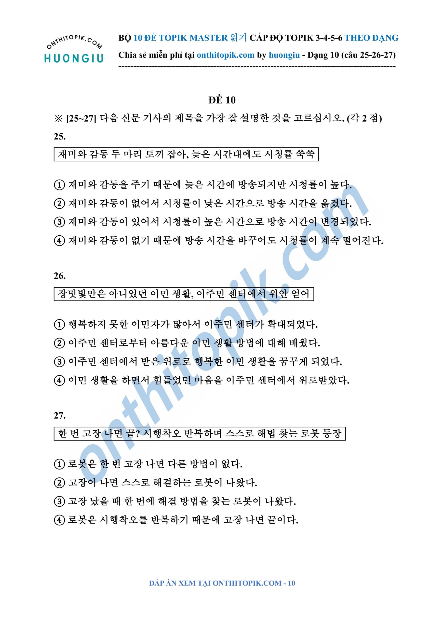 onthitopik.com đã tổng hợp Bộ 10 đề ĐỌC TOPIK MASTER chia dạng (dạng 10 câu 25-27), các bạn có thể tham khảo làm theo dạng nha!!!