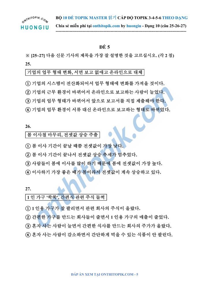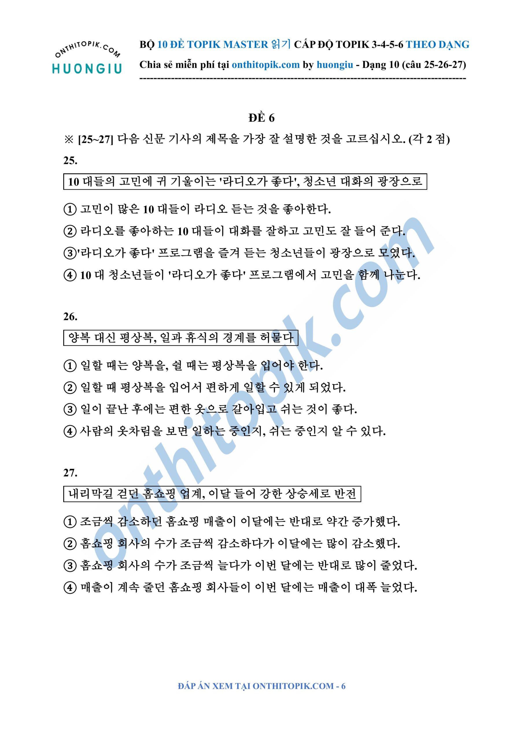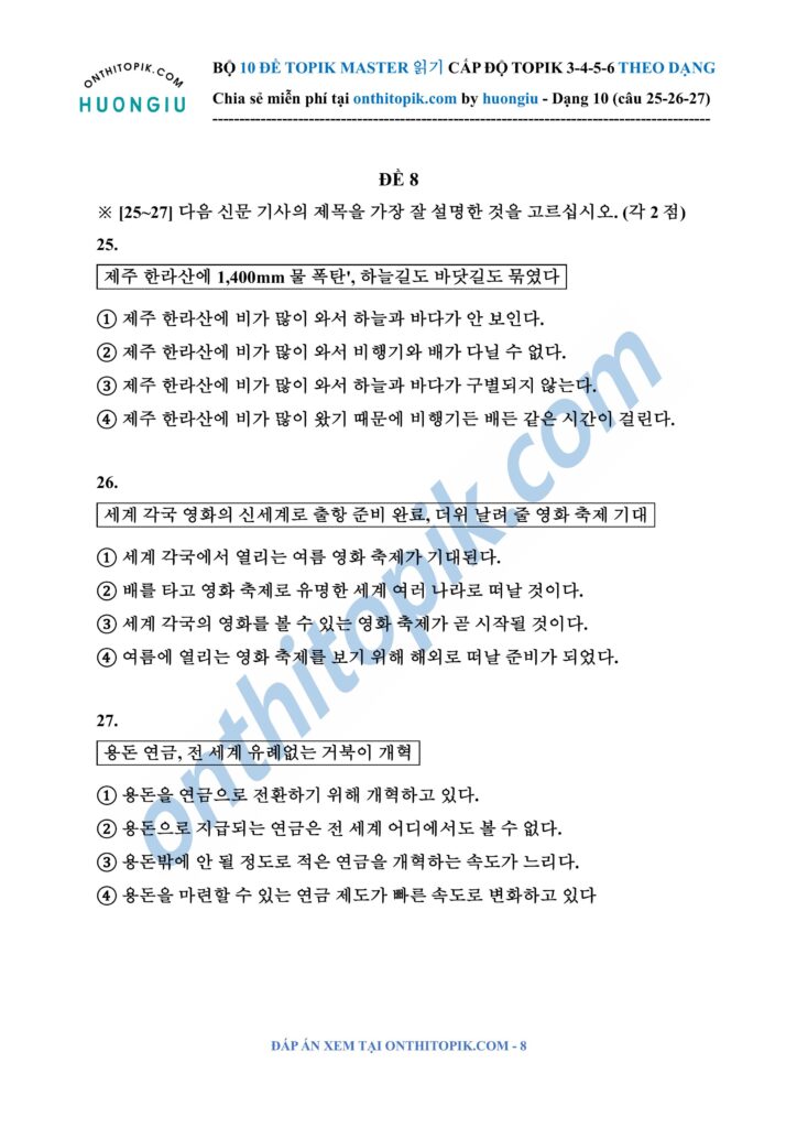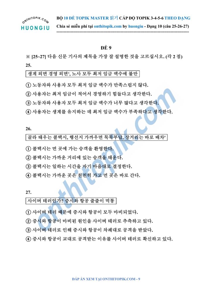 onthitopik.com đã tổng hợp Bộ 10 đề ĐỌC TOPIK MASTER chia dạng (dạng 10 câu 25-27), các bạn có thể tham khảo làm theo dạng nha!!!