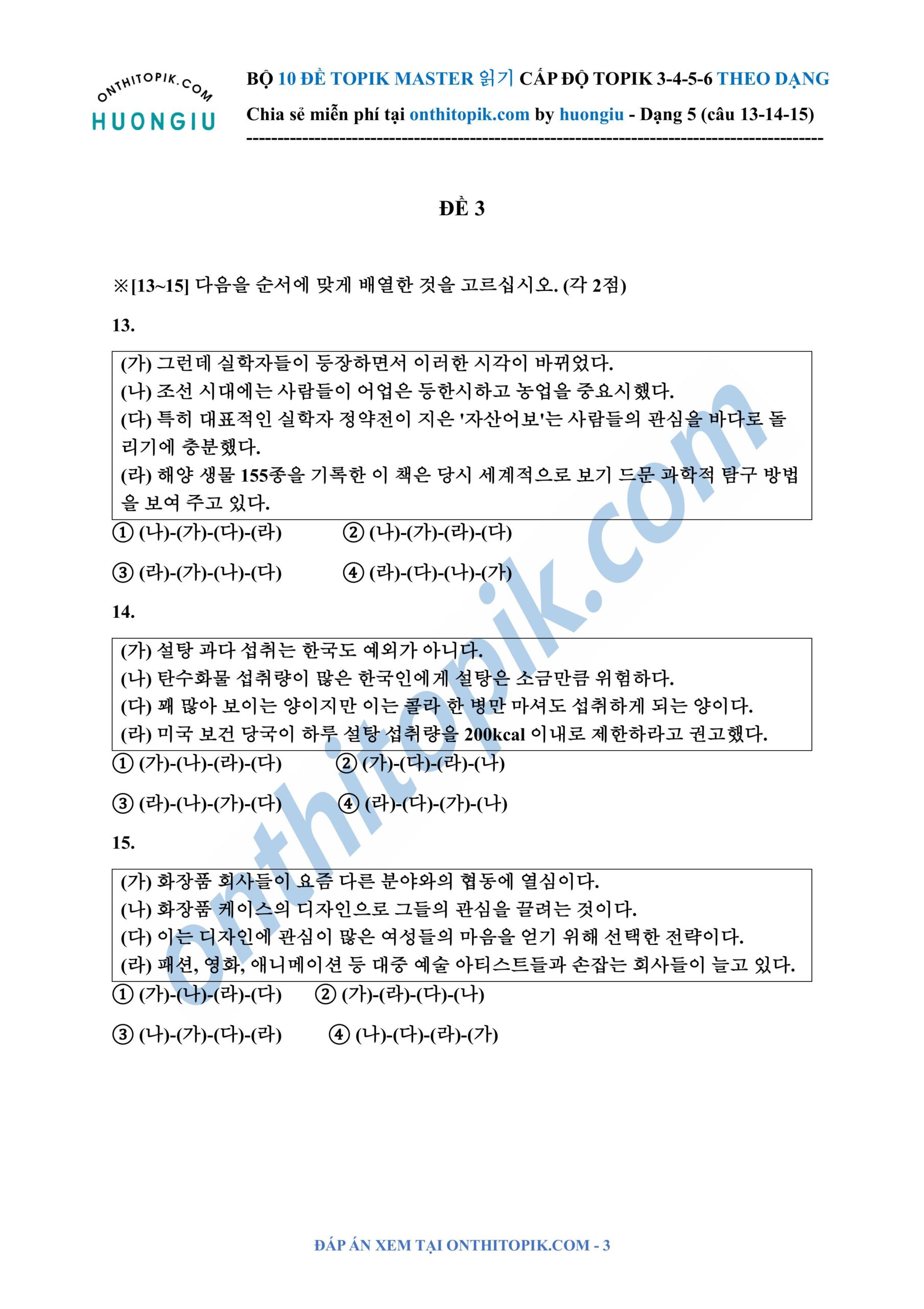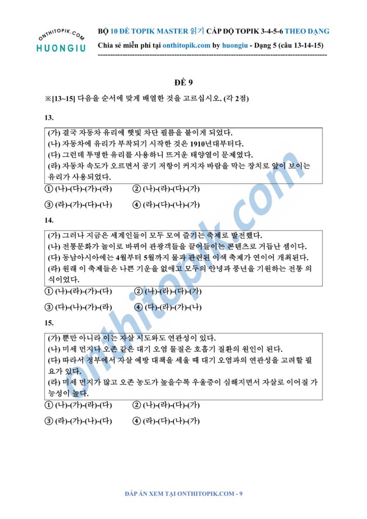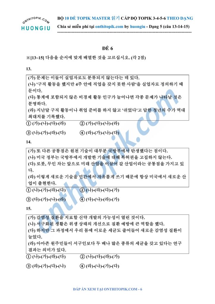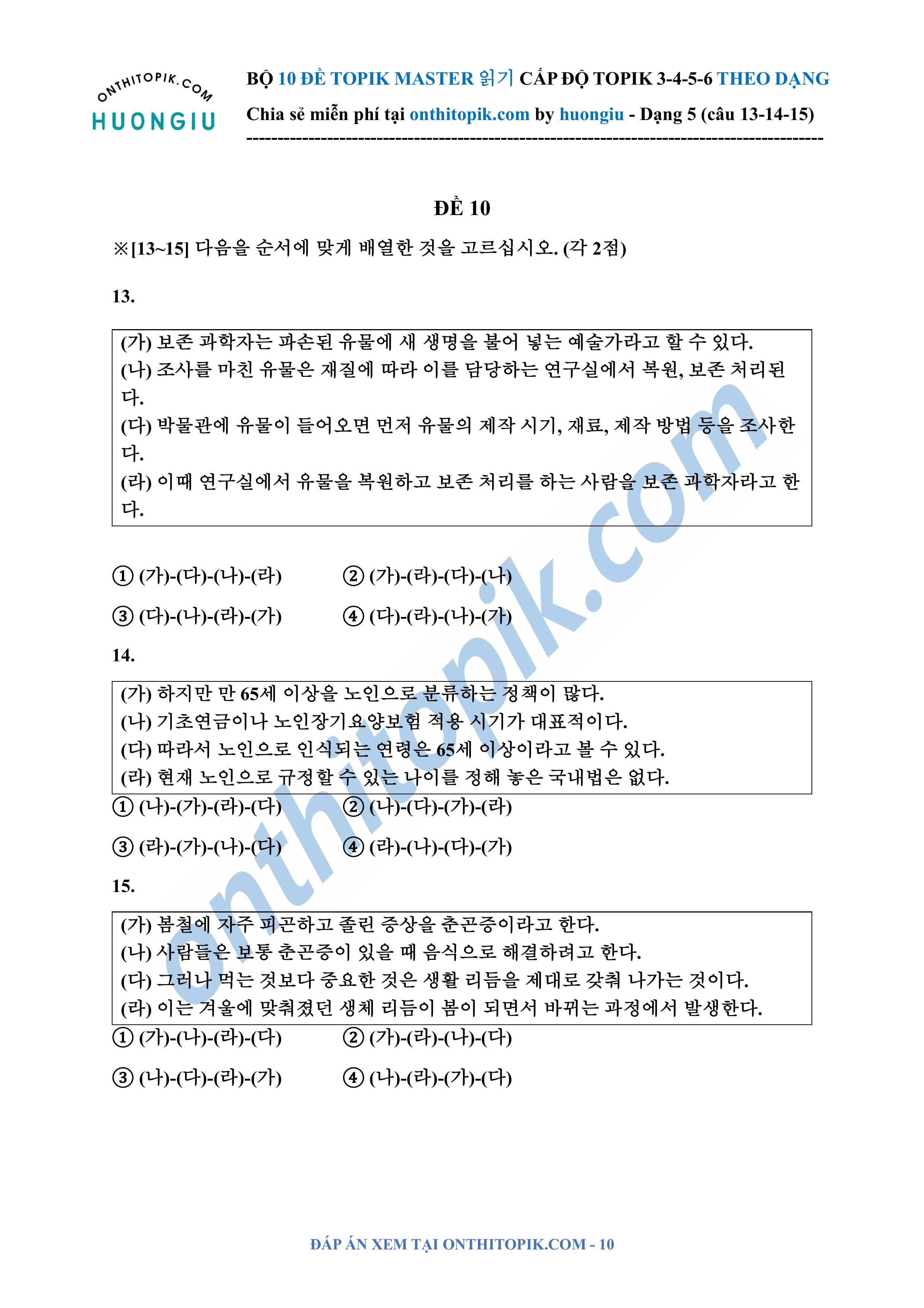 onthitopik.com đã tổng hợp Bộ 10 đề ĐỌC TOPIK MASTER chia dạng (dạng 5 câu 13-15), các bạn có thể tham khảo làm theo dạng nha!!!