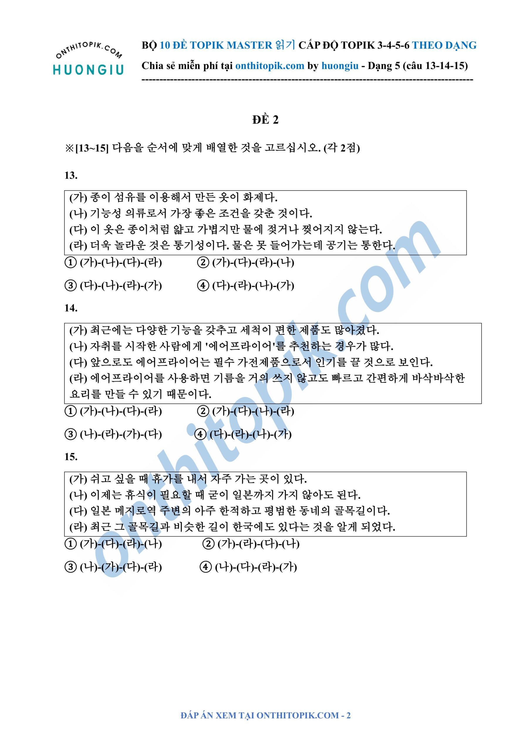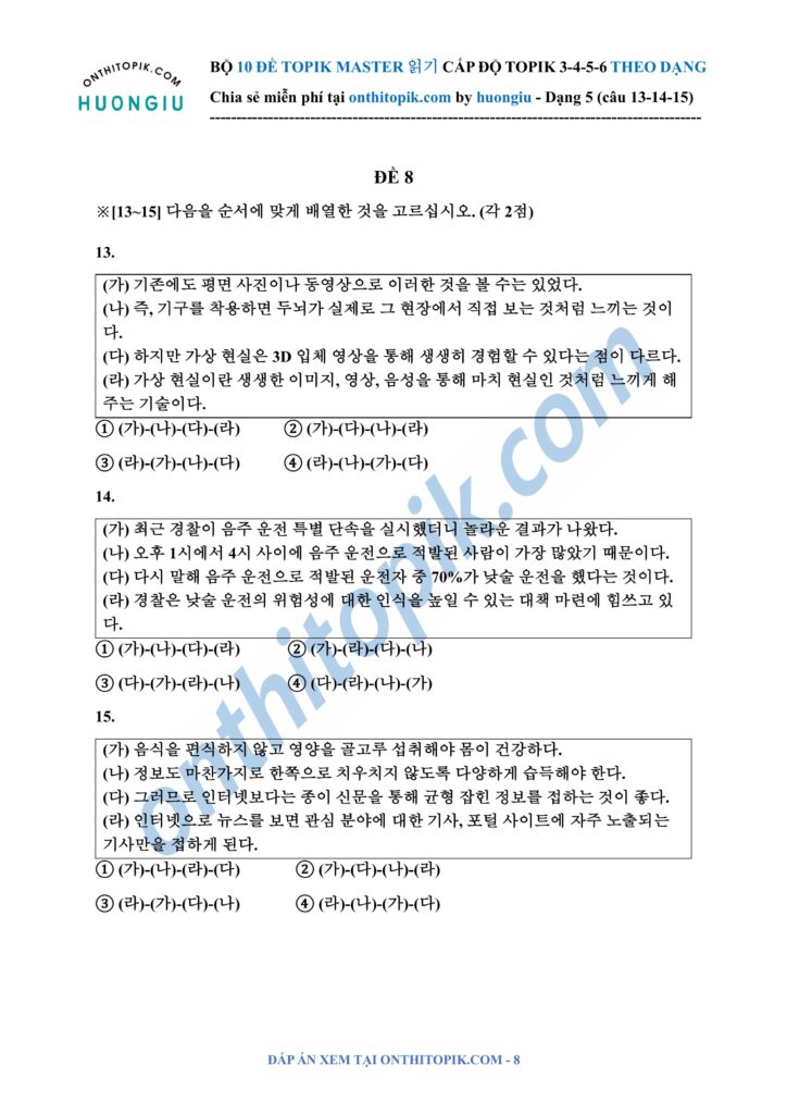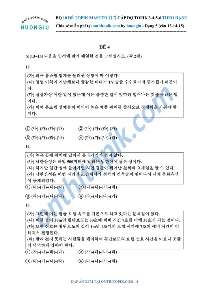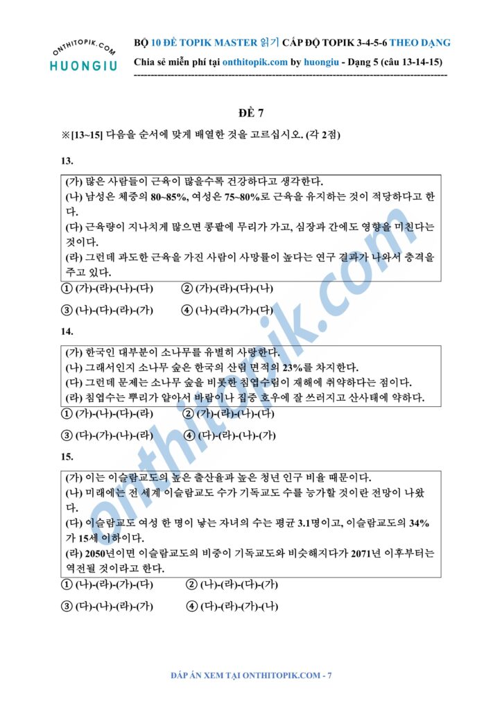 onthitopik.com đã tổng hợp Bộ 10 đề ĐỌC TOPIK MASTER chia dạng (dạng 5 câu 13-15), các bạn có thể tham khảo làm theo dạng nha!!!