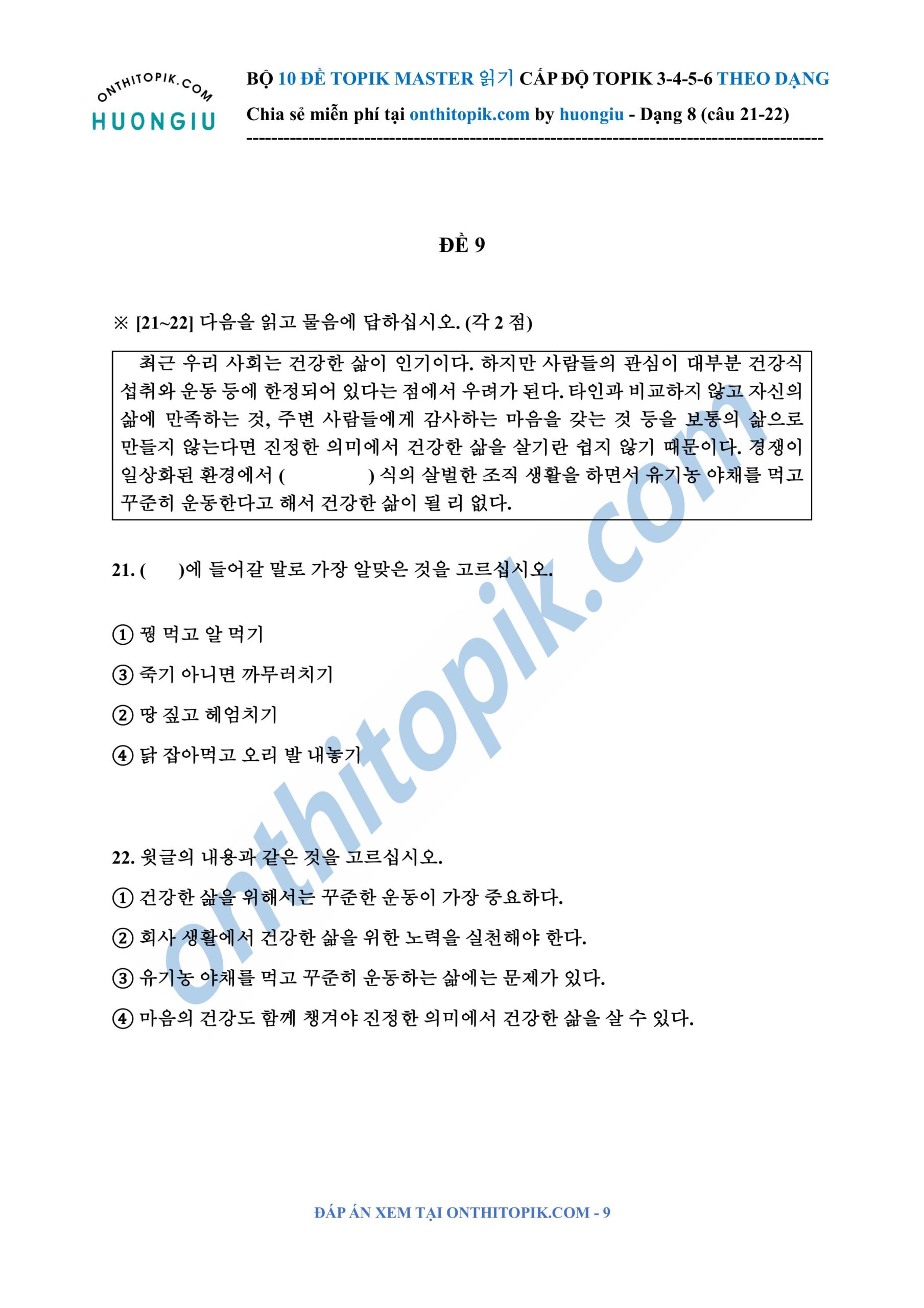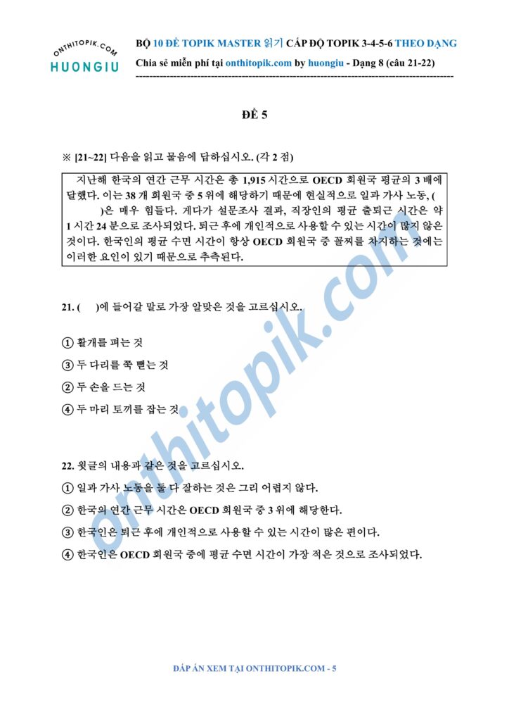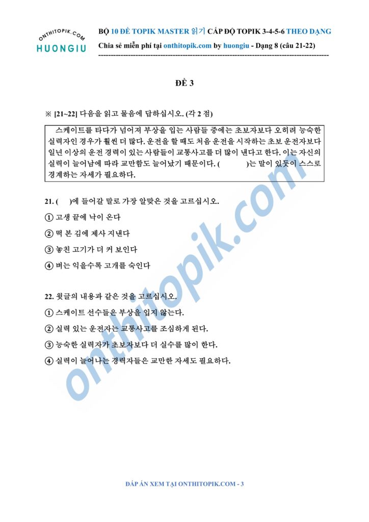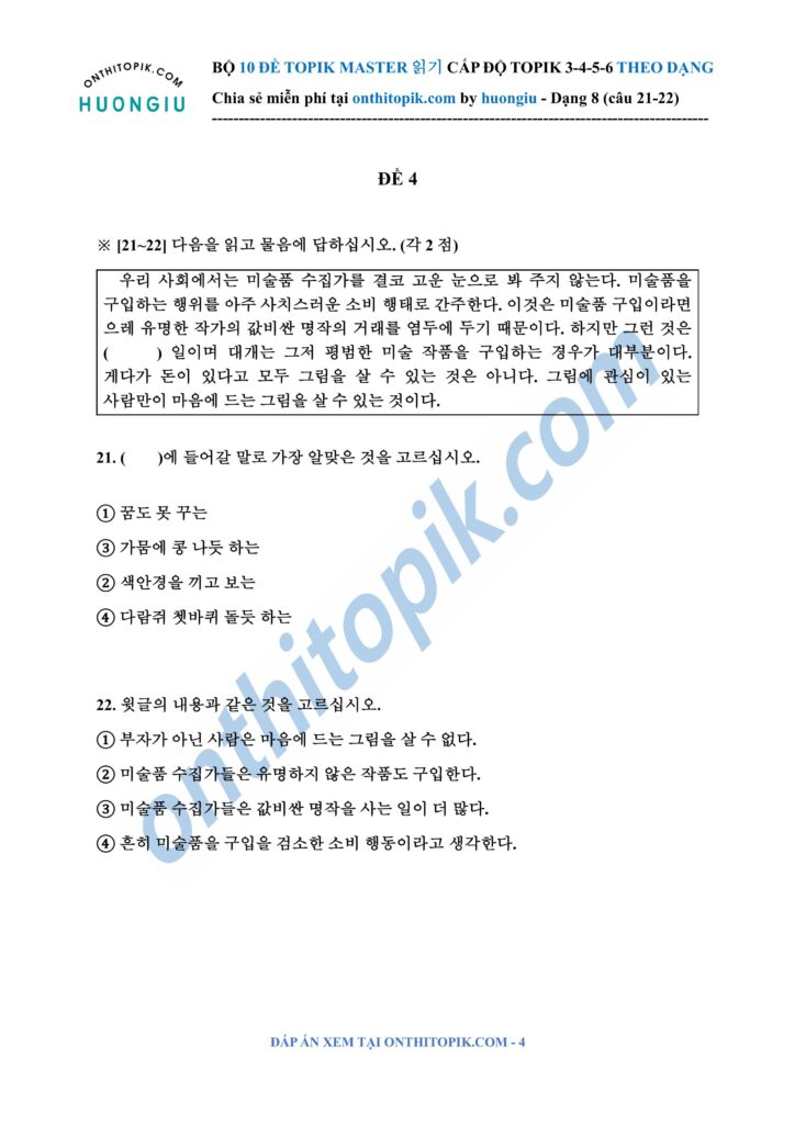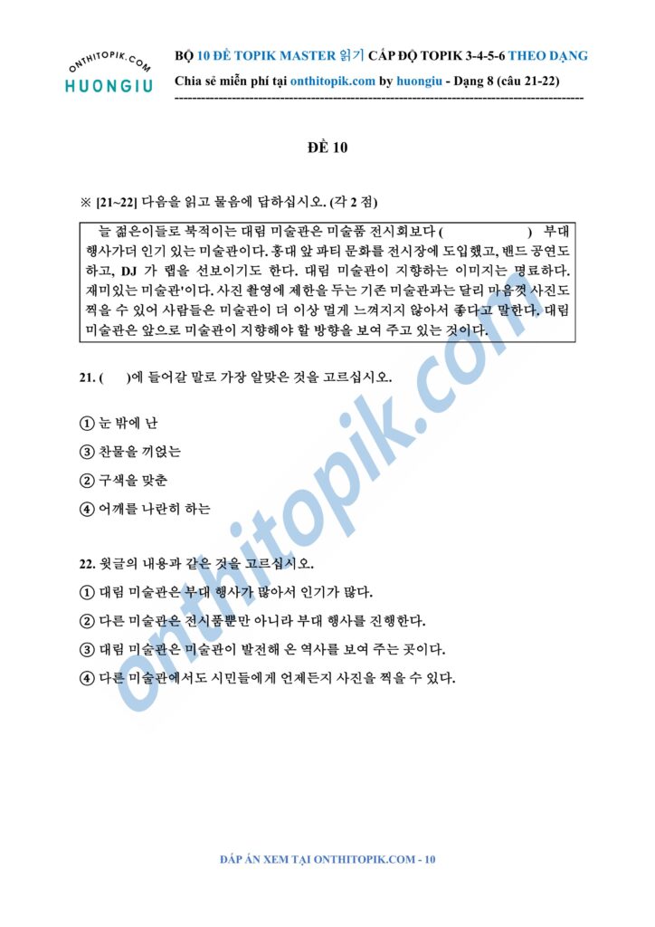 onthitopik.com đã tổng hợp Bộ 10 đề ĐỌC TOPIK MASTER chia dạng (dạng 8 câu 21-22), các bạn có thể tham khảo làm theo dạng nha!!!