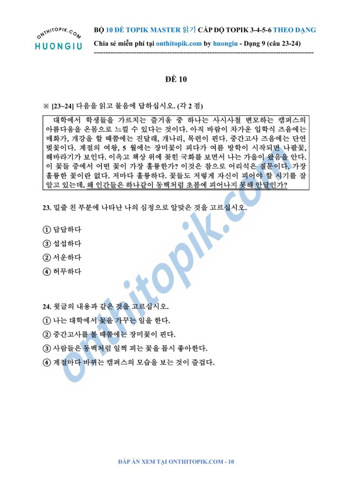 onthitopik.com đã tổng hợp Bộ 10 đề ĐỌC TOPIK MASTER chia dạng (dạng 9 câu 23-24), các bạn có thể tham khảo làm theo dạng nha!!!