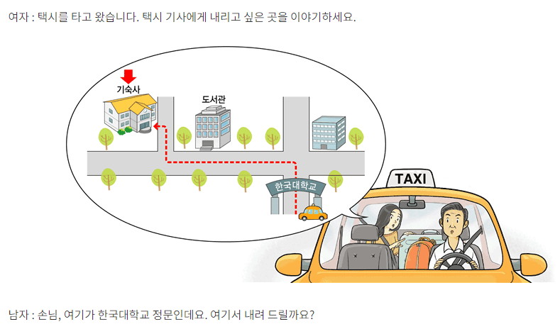 Đáp án tham khảo: 아니요, 기사님. 학교 안에 있는 기숙사까지 가 주세요. 정문으로 들어가면 사거리가 나오는데, 거기에서 왼쪽으로 가시면 돼요. 가다 보면 도서관이 나와요. 도서관을 지나서 조금 가면 오른쪽에 작은 길이 있어요. 그 길로 조금 가면 왼쪽에 기숙사가 있어요. 그 앞에서 내려 주세요.