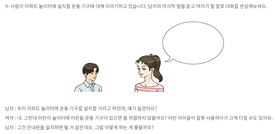 Đáp án tham khảo: 안내문을 설치해도 문제가 해결될 것 같지는 않아요. 아이들은 안내문을 잘 읽지 않고, 또 놀이터에는 글을 잘 모르는 어린 아이들도 많이 오잖아요. 놀이터는 아이들이 안전하고 즐겁게 뛰어놀 수 있는 곳이어야 된다고 생각해요. 그렇기 때문에 아이들에게 위험할 수 있는 운동 기구를 놀이터에 설치하는 건 안 좋은 것 같아요. 어른들을 위한 운동 기구는 놀이터가 아닌 다른 장소에 설치하면 좋겠어요.