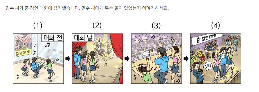 Đề bài: 그림을 보고 순서대로 이야기하십시오. 40초 동안 준비하십시오. ‘삐’ 소리가 끝나면 60초 동안 말하십시오.