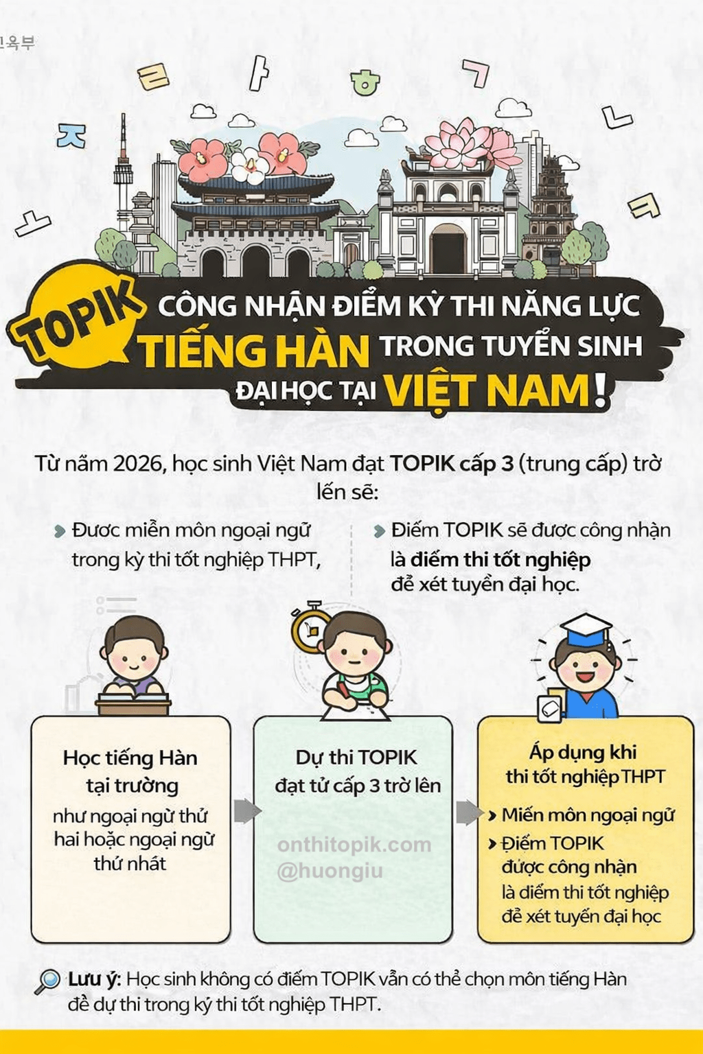 Từ năm 2026, điểm Kỳ thi năng lực tiếng Hàn (TOPIK) sẽ được chính thức công nhận để thay thế môn ngoại ngữ trong kỳ thi tốt nghiệp THPT, qua đó sử dụng trực tiếp trong xét tuyển đại học tại Việt Nam.