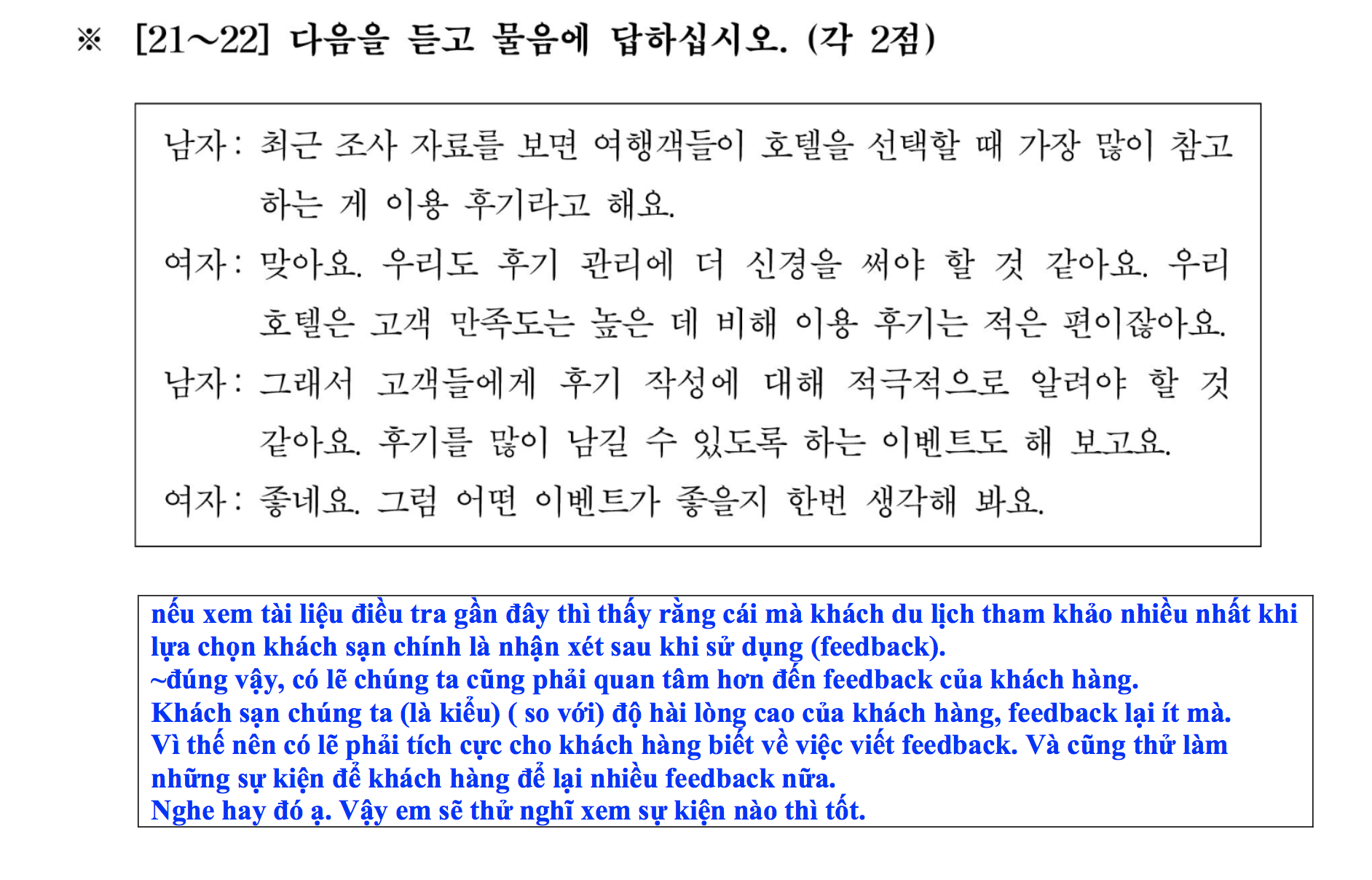 Bài nghe và dịch chi tiết 듣기 TOPIK II dạng 6 [câu 21-22] 8 đề chính thức từ kì số 35 đến kì số 64. Các bạn luyện nghe và chữa bài theo hướng dẫn nhé!