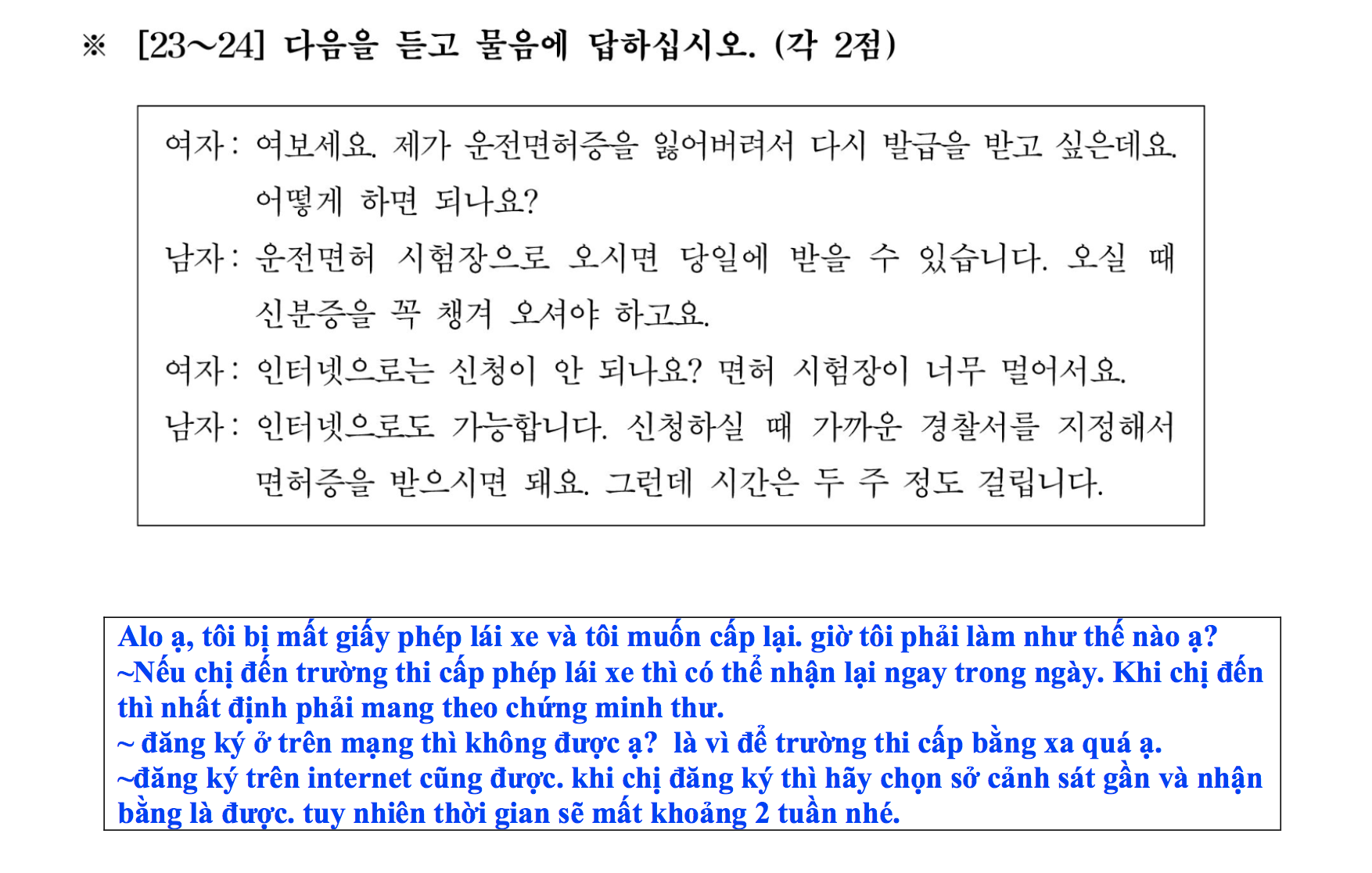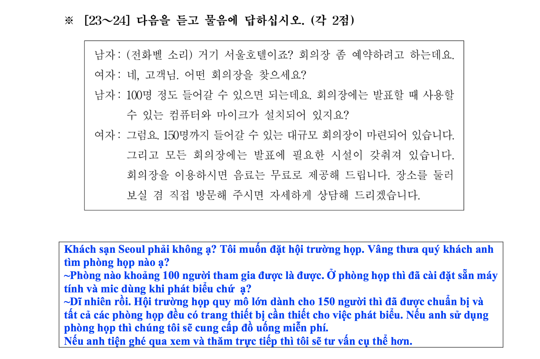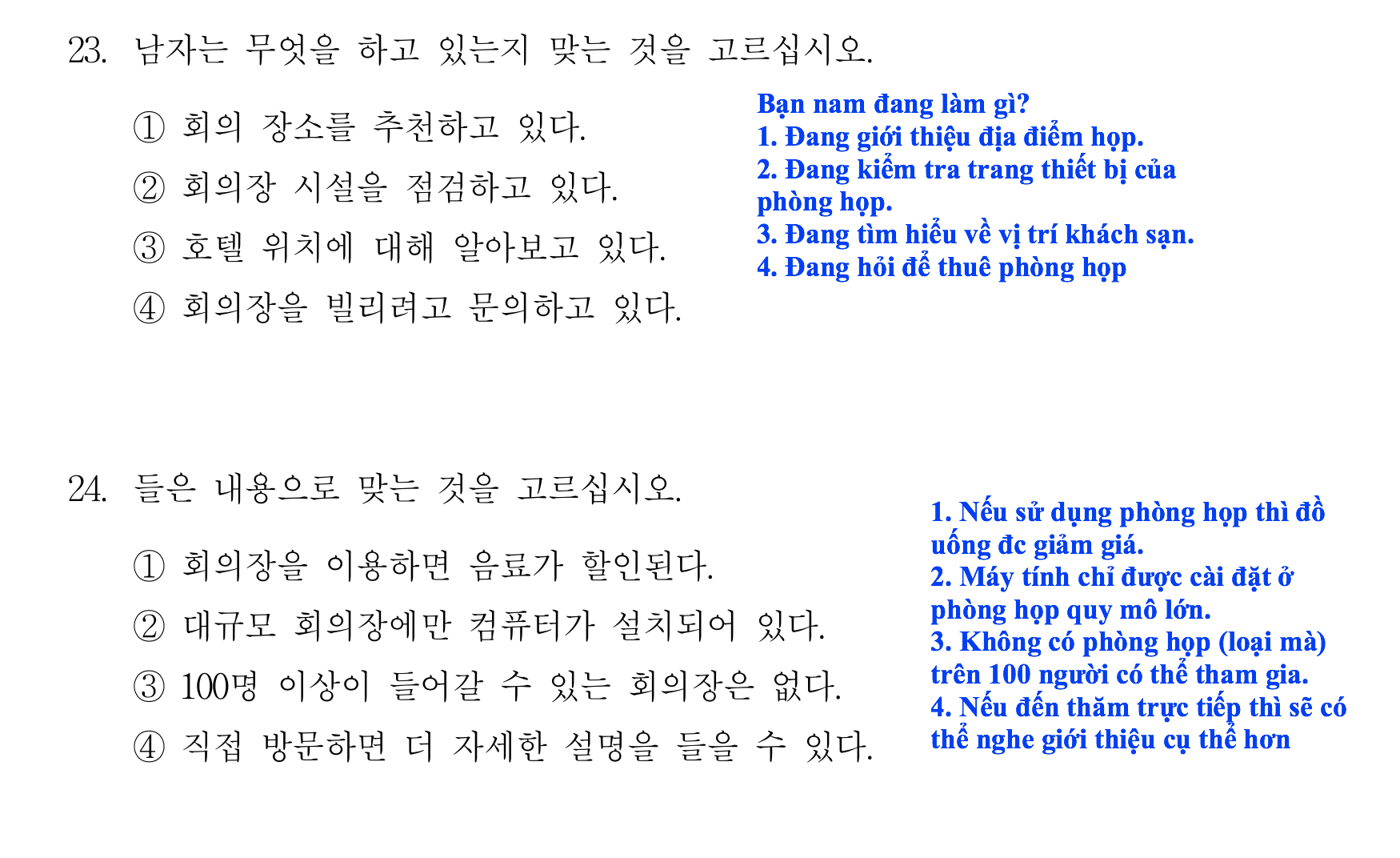 Bài nghe và dịch chi tiết 듣기 TOPIK II dạng 7 [câu 23-24] 8 đề chính thức từ kì số 35 đến kì số 64. Các bạn luyện nghe và chữa bài theo hướng dẫn nhé!