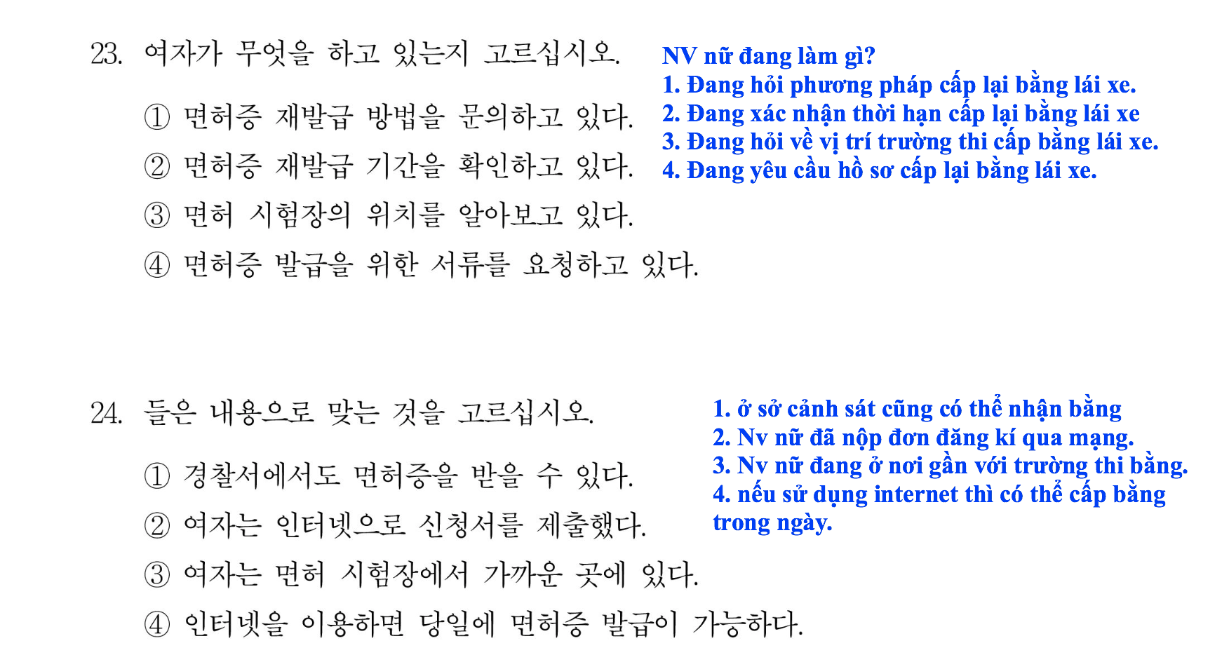 Lần lượt 8 đề TOPIK 듣기 NGHE CÂU 23-24 như dưới đây:
