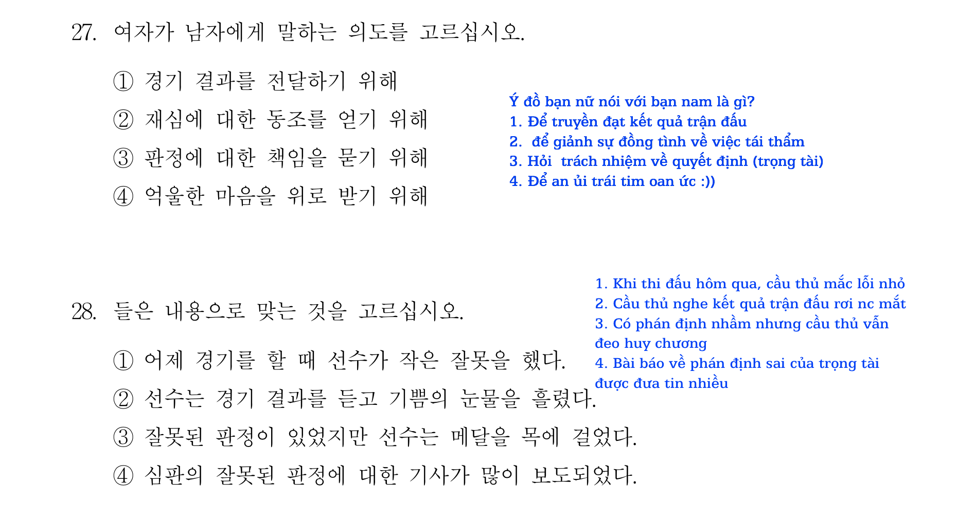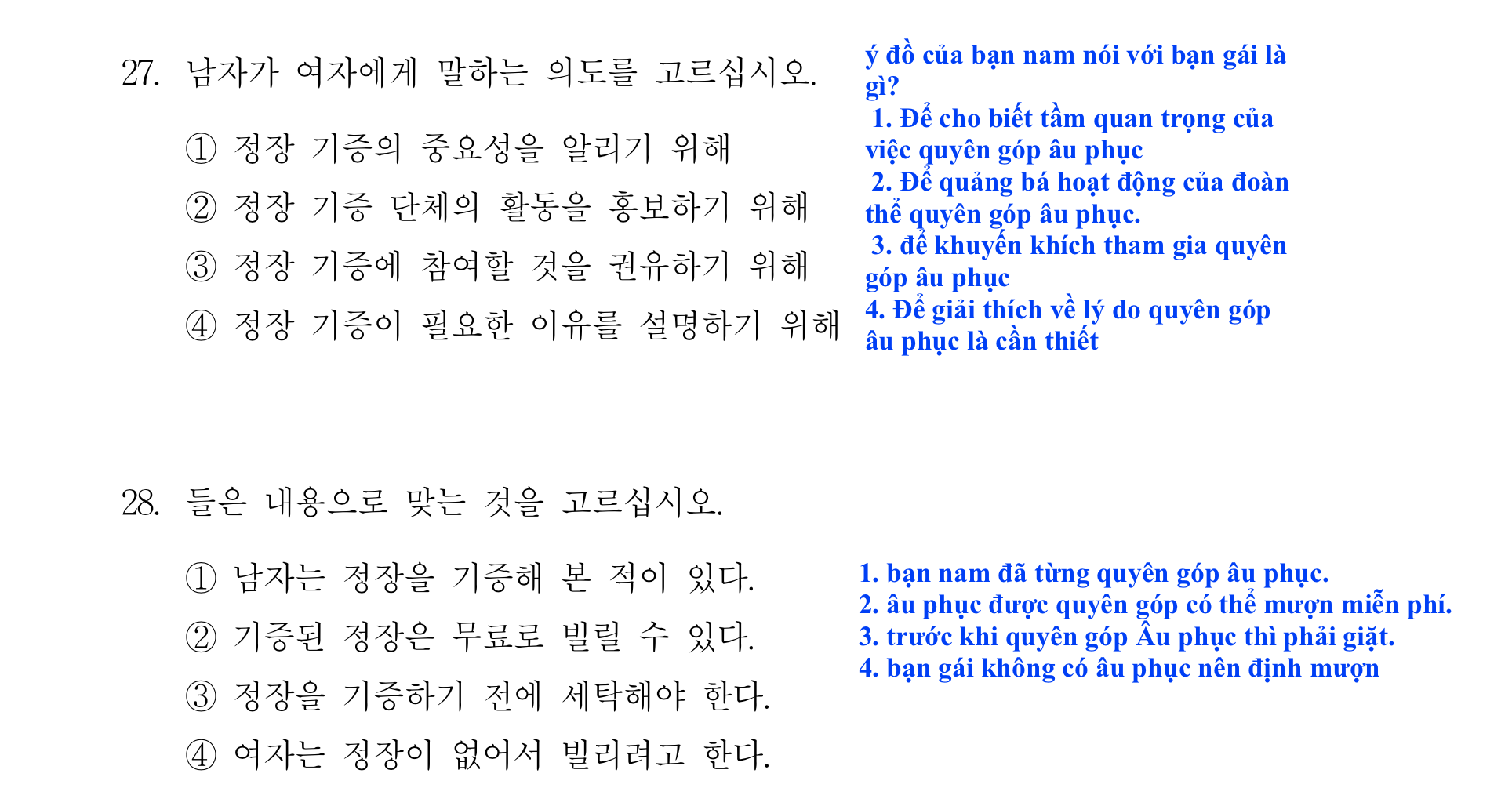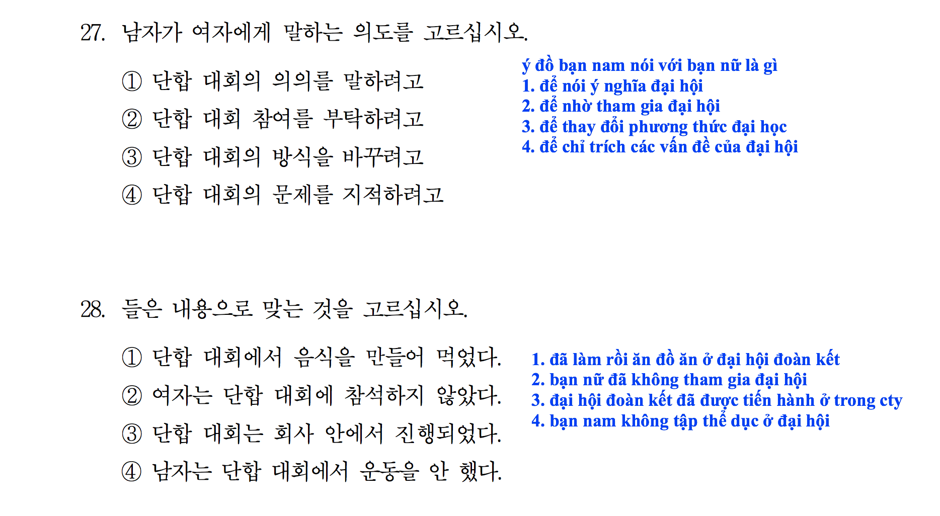 Lần lượt 8 đề TOPIK 듣기 NGHE CÂU 27-28 như dưới đây: