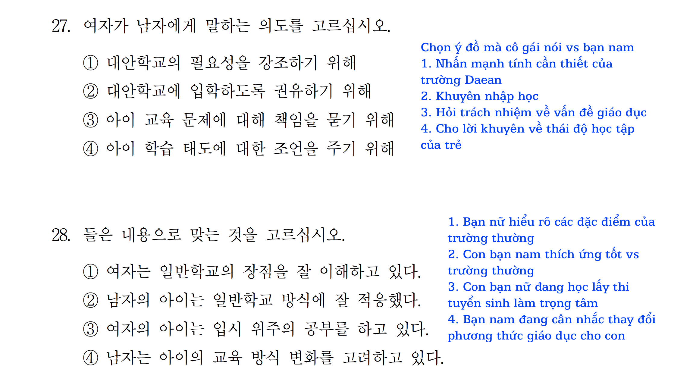 Bài nghe và dịch chi tiết 듣기 TOPIK II dạng 9 [câu 27-28] 8 đề chính thức từ kì số 35 đến kì số 64. Các bạn luyện nghe và chữa bài theo hướng dẫn nhé!