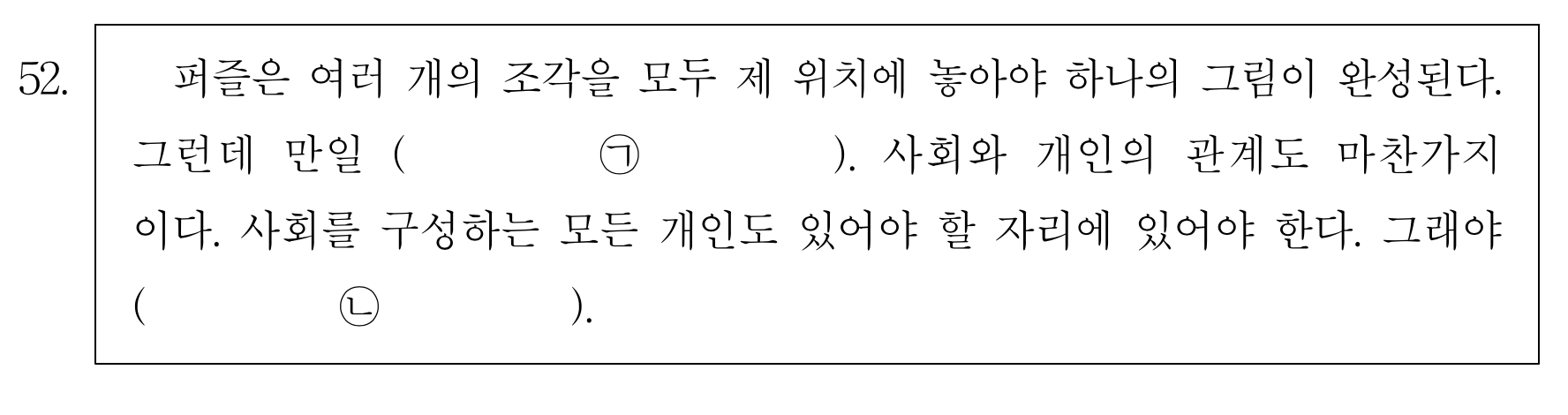 | Kỳ thi TOPIK 35 | (ᄀ) 퍼즐 조각이 제 자리에 놓이지 않으면 그림은 완성되지 않는다 (ᄂ) 비로소 사회가 하나로 돌아가기 때문이다 |