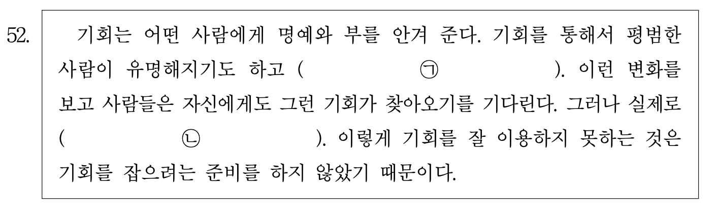 | Kỳ thi TOPIK 36 | (ᄀ) 가난한 사람이 부자가 되기도 한다 부자가 되기도 한다 (ᄂ) 기회가 와도 그 기회를 잘 이용하지 못한다 찾아온 기회를 놓치는 사람들이 많다 기회가 찾아오면 활용하지 못하는 사람들이 많다 |
