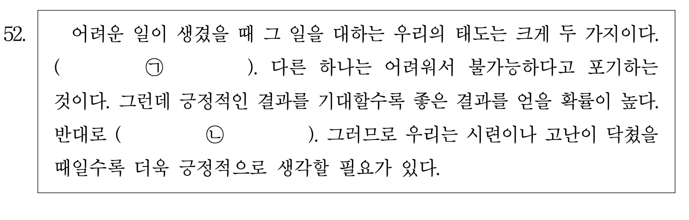 | Kỳ thi TOPIK 37 | (ㄱ) 하나는 아무리 어려워도 절대 포기하지 않는 것이다 하나는 가능하다는 믿음을 가지고 긍정적인 결과를 기대하는 것이다 (ㄴ) 부정적으로 생각하면 좋은 결과를 얻기 어렵다 부정적인 생각을 하면 좋은 결과를 얻을 확률이 낮다 |