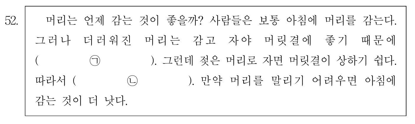 | Kỳ thi TOPIK 41 | (ᄀ) 머리는 저녁에 감는 것이 좋다 (ᄂ) 자기 전에 머리를 말리고 자야 한다 |