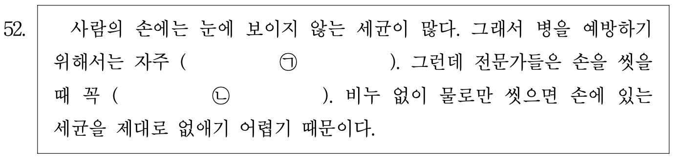 | Kỳ thi TOPIK 47 | (ㄱ) 손을 씻어야 한다 (ㄴ) 비누를 사용하라고 한다 비누로 씻으라고 한다 |