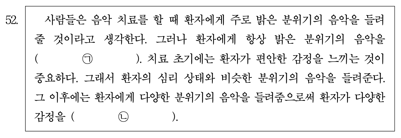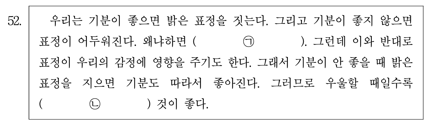| Kỳ thi TOPIK 52 | (ㄱ) 감정이 표정에 영향을 주기 때문이다 (ㄴ) 밝은 표정을 짓는/하는 표정을 밝게 짓는/하는 |