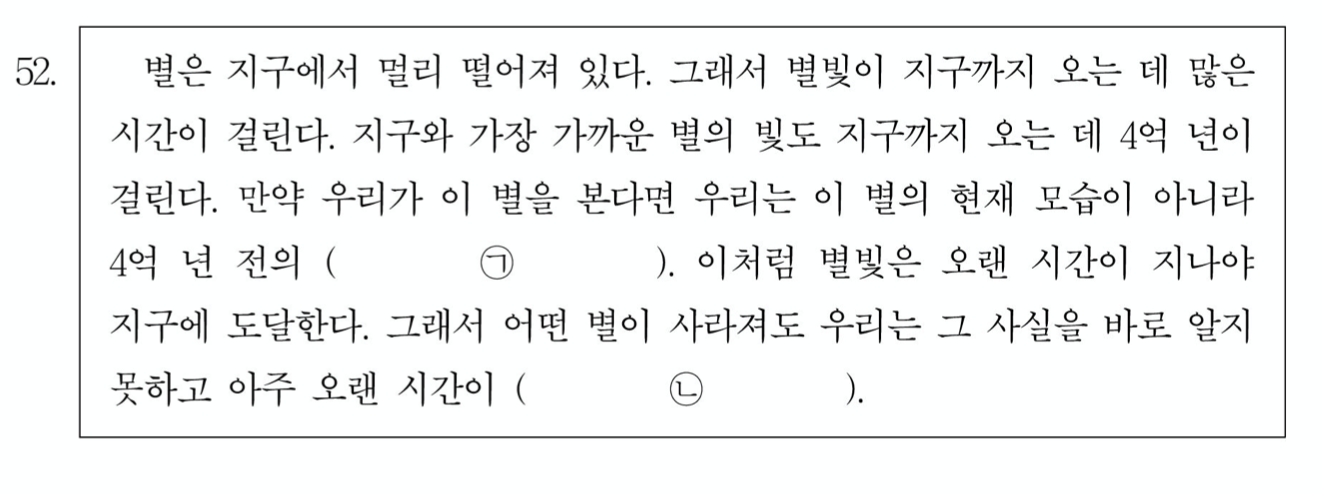 | Kỳ thi TOPIK 64 | (ㄱ) 모습을 보는 것이다 (ㄴ) 지나야 알 수 있다 지난 후에야 알 수 있다 |