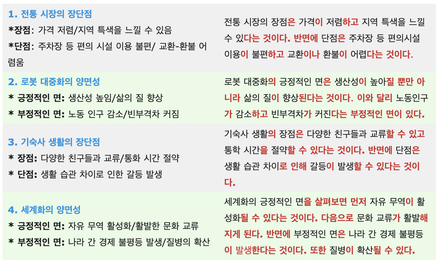 도시 생활의 장단점 * 장점: 다양한 문화생활 / 최신 의료 시설 이용 * 단점: 비싼 물가 / 공해 발생 | 도시 개발의 양면성 * 긍정적인 면: 주택 문제 해결 / 주거 환경 개선 * 부정적인 면: 땅값 상승 / 환경 오염 문제 발생 |