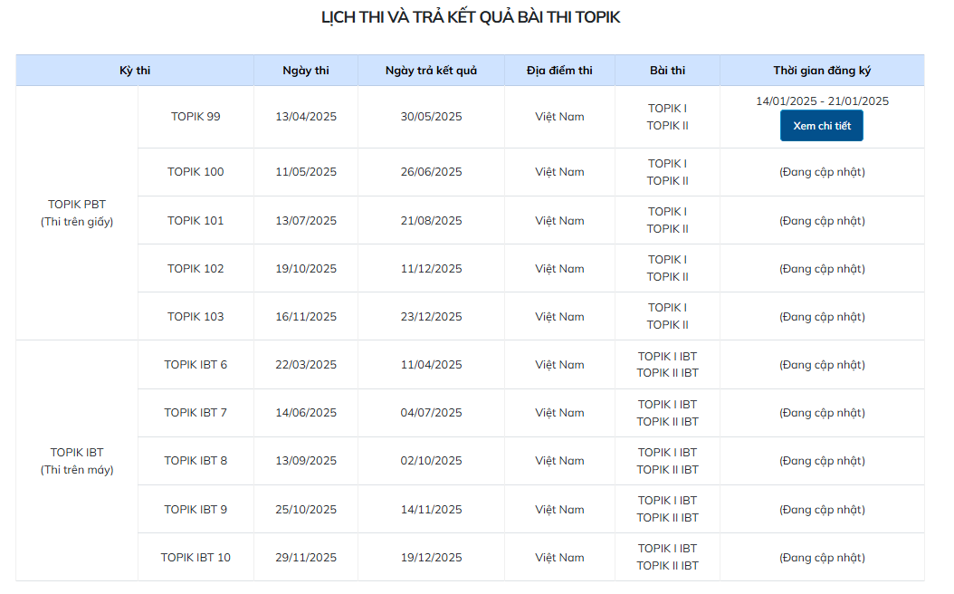 Lịch thi TOPIK 2025 chính thức tại Việt Nam (thi giấy và thi trên máy tính) các bạn tham khảo nhé.